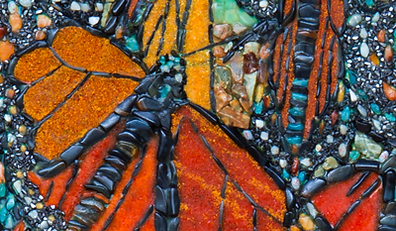 In "Twilight", Schar creates a twisting composition emphasizing the fluttering motion of wings. Here the flock of butterflies takes the form of a brilliant Z against strong black shadows in a blue sky of Brazilian chalcanthite. This painting was inspired by Ilya's admiration for the Russian painter Mikhail Vrubel (1856 - 1910). One of Vrubel's techniques was to cover the surface of the canvas with dots and then to draw connecting lines to form his composition. Schar pays homage to Vrubel by using a similar technique.